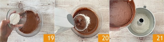 Finally, incorporate the sifted baking powder 19 and mix with the electric beaters 20. Pour the batter into a 8.6-inch bundt pan, previously greased 21.