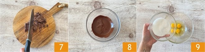Now chop the dark chocolate 7 and melt it in a double boiler or microwave. Be careful not to overheat it 8 and let it cool slightly before using. In the meantime, pour the eggs into a bowl and add the sugar 9.