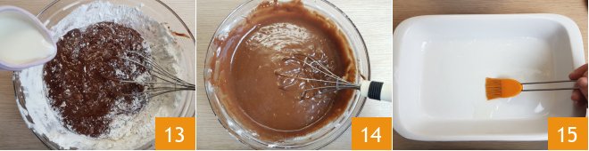 Finally, add the remaining 7 tbsp of milk 13 and mix very well, still using the hand whisk, until you get a smooth and homogeneous mixture 14. Take a 12x8 inch rectangular baking dish and brush it with a little oil 15, just to make the parchment paper stick.