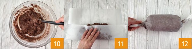 Mix with a spoon until you get a homogeneous mixture 10. Pour the mixture onto the center of a sheet of parchment paper, lift the bottom edge 11 and roll it up completely, then twist the ends to seal the cylinder 12. Let it set in the refrigerator for at least 6 hours, or better yet, overnight. Alternatively, you can put it in the freezer for a couple of hours.
