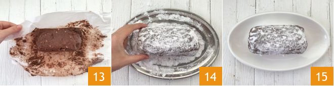 After the cooling time has passed, remove the parchment paper 13 and cover the salami with plenty of powdered sugar 14. Your chocolate and nougat salami is ready to be served 15!
