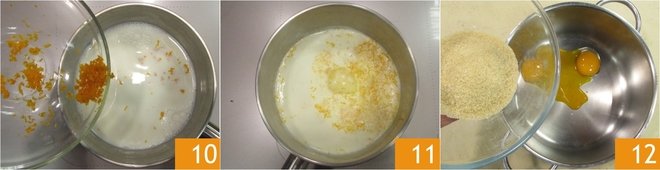 Move on to the cream: pour the milk and orange zest into a saucepan 10 and bring to a low boil 11. Meanwhile, mix the egg yolks and brown sugar in another saucepan using a spatula to incorporate as little air as possible 12.