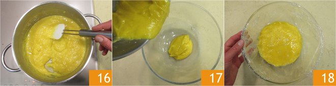 Place the mixture on the heat and cook for about 5 minutes, stirring occasionally 16. When you have obtained a smooth and thick cream, transfer it to a bowl 17 and cover with contact plastic wrap 18. Let cool and refrigerate for about an hour.