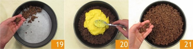 After this time, you are ready to assemble the cake: line a 20 cm (8-inch) diameter mold with parchment paper and spread half of the dough to cover the entire base 19. Pour the orange cream and level it with the back of a spoon, leaving a couple of inches from the edge 20, then crumble the remaining dough to cover the entire surface 21.