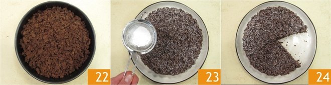 Gently press the surface of the cake with your hands and bake in a preheated static oven at 356°F (180°C) for 45 minutes 22. Once cooked, remove from the oven and let cool. Dust the chocolate and orange crumble cake with a little powdered sugar 23 and serve at room temperature 24!