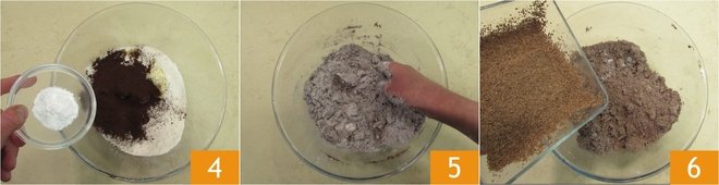 Add the baking powder 4 and knead with your fingertips to obtain a sandy mixture 5. At this point, add the grated chocolate 6.