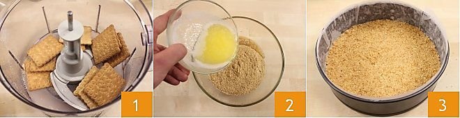 To prepare the chocolate and pear cheesecake, start by preparing the base: place the dry cookies in the mixer and blend until finely ground 1. Melt the butter in a saucepan and, in the meantime, transfer the ground cookies to a bowl. Gradually add the melted butter to the ground cookies, mixing everything well 2. Butter a cake pan, preferably with a removable bottom, with a diameter of 9 inches, and then line the bottom and sides with parchment paper (learn how by reading the Cooking School: lining a cake pan with parchment paper, How to line a cake tin with parchment paper). Pour the crumbled cookies into the cake pan lined with parchment paper and press the cookie base firmly with a spoon 3. Chill the mixture in the refrigerator for half an hour or in the freezer for about ten minutes.