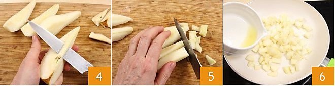 Now focus on the cream: clean the pears by peeling and seeding them 4, then cut them into cubes 5. Place the cubed pear in a non-stick pan and cook with the lemon juice 6.