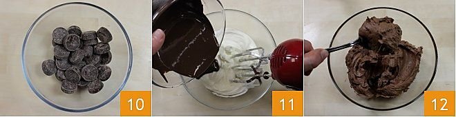 Now prepare the chocolate to be combined with the cream cheese: place the dark chocolate in a bowl 10 and set it in a saucepan filled halfway with water. Then turn on the heat and melt the chocolate in a double boiler. In a separate bowl, place the fresh cream cheese and powdered sugar and mix the two ingredients with an electric beater. Then add the melted chocolate and mix 11. Once you have a smooth mixture 12, transfer it to a stand mixer (or a large bowl to work with an electric mixer), add the eggs, and start the beaters.
