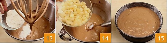 While the beaters are running, slowly add the milk. Mix everything well and add the sifted cornstarch 13. When the mixture is smooth and homogeneous, turn off the stand mixer and add the pears, mixing with a spatula 14. Your chocolate cream cheese mixture will then be ready. Take the now firm cookie base from the fridge and fill it with the cream 15. Bake in a static oven for one hour at 338°F (if using a convection oven, bake at 302°F for 50 minutes). Once the cheesecake is cooked, let it cool in the fridge for 4 hours. With the pear set aside for decoration, garnish the cake as you prefer, for example by cutting the pear into thin slices and arranging them in a fan shape.