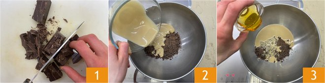 To prepare the chocolate and tahini treats, first chop the dark chocolate 1 and melt it in a double boiler with the tahini 2 and honey 3. Stir until all the chocolate is melted and you have a homogeneous mixture.