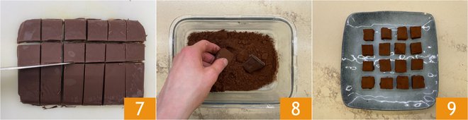 After the setting time, cut the slab into regular cubes 7, then roll them in cocoa powder 8. Your chocolate and tahini treats are ready to be served 9!