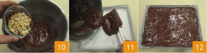 pour the chocolate into it 7 while whipping, then add the sifted dry ingredients one tablespoon at a time 8, without stopping the mixer. Coarsely chop the hazelnuts 9