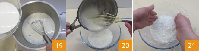 then pour it into the saucepan 19, thicken the cream by continuously stirring with a whisk, it should have the consistency of an English cream that should "coat" the spoon, transfer it into a bowl 20, cover with plastic wrap on contact 21, and place it in the refrigerator for at least 1 hour.