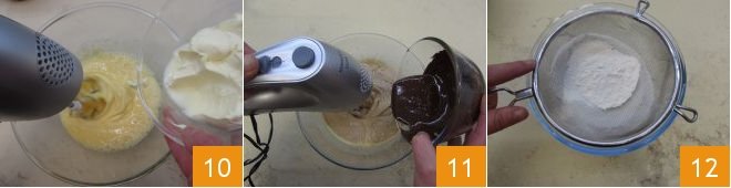 Then add the sour cream prepared earlier, which you will have stirred with a spoon before using it in the recipe 10; once incorporated, add the melted and cooled chocolate 11; mix everything thoroughly. In a separate bowl, sift the flour 12