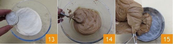 and the baking powder 13; then gradually incorporate the two powders into the rest of the mixture, mixing well with a whisk until smooth and lump-free 14. Then butter and line a 9-inch cake pan with parchment paper, then pour the batter inside 15.