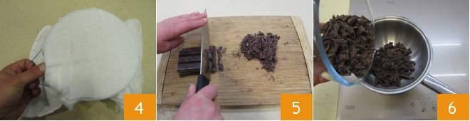 Cover the bowl with a clean cloth or a cheesecloth 4 and let it rest at room temperature for 24 hours. At this point, you can proceed with making the cake: coarsely chop the chocolate 5 and melt it in a double boiler 6.