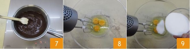 Stir the chocolate with a spatula and continue until it is melted 7. Then pour the eggs into a bowl 8, add the sugar, and whisk everything together 9 until the mixture is light and fluffy.