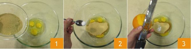 To prepare the chocolate chip loaf cake, first melt the butter in a small saucepan and let it cool. Meanwhile, pour the eggs into a large bowl, add the sugar 1, salt 2, and the grated zest of half an orange 3.