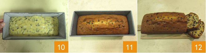 Butter and flour a loaf pan measuring 10x4.3 inches and pour the batter inside 10. Bake in a preheated static oven at 356°F for 50 minutes, positioning the pan on the middle rack. Before taking it out, do the toothpick test, then let it cool. Your chocolate chip loaf cake is ready to be enjoyed 12!