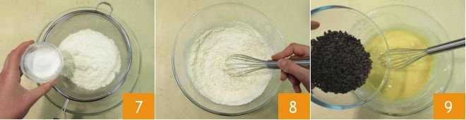 Now sift the flour and baking powder into the bowl 7 and incorporate them with the whisk until you have a smooth and homogeneous mixture 8. Finally, add the chocolate chips 9 and stir to incorporate the powders evenly.