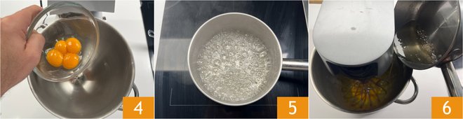 Meanwhile, place the egg yolks in the bowl of the stand mixer 4. If you don't have a kitchen thermometer, you'll know the syrup has reached the correct temperature when white bubbles form on the surface 5. Start whisking the egg yolks and slowly pour in the syrup once it reaches the temperature 6. Continue whisking for 5 minutes, until the mixture cools down.