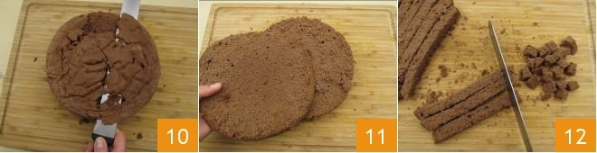 Take the second sponge cake and clean it both on the top and the bottom as before 10. Then cut out two discs 11 and cut each disc first into strips about 0.6 inches wide and then into small cubes 12.