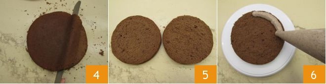 When the sponge cakes are completely cool, you can unmold them 1. Take the first one, remove the top crust using a long-bladed knife 2 and divide it in half 3.