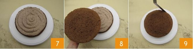 You should use about 2/3 of it, spreading it over the entire surface of the cake 7. Then cover with the second disc 8, press lightly with your hands, and, using a spatula, smooth the cream on the edges 9 and place the cake in the refrigerator for about 30 minutes.