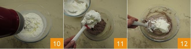 At this point, whip the cream 10 and when it is well whipped, add it in three parts to the mixture you just prepared 11, always mixing gently from bottom to top with a spatula 12.