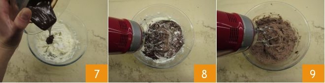 and the melted chocolate 7. Continue mixing 8 until you obtain a homogeneous mixture 9.