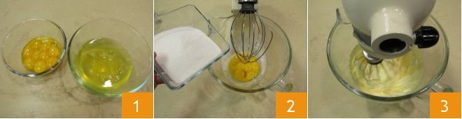 Set aside and whisk the egg whites with the remaining sugar 4 until the mixture is white and frothy 5. Incorporate the yolks into the egg whites little by little 6,