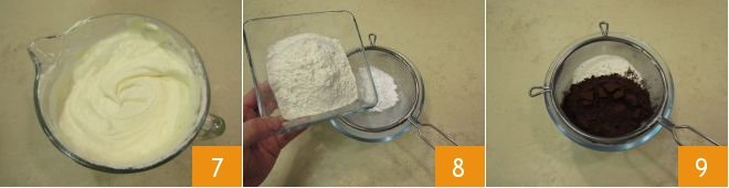 gently mixing with a spatula from bottom to top to prevent the mixture from deflating 7. In a bowl, sift the cornstarch, flour 8, and cocoa powder 9.