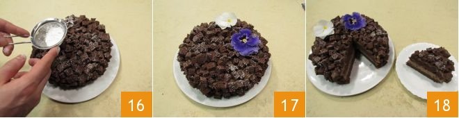 Take the cake from the fridge and cover it with the remaining cream 13, using a spatula to spread the cream evenly on both the surface and the edges 14. At this point, cover it with the cocoa sponge cake cubes made earlier 15