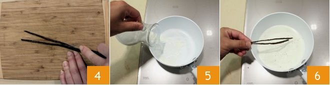 Split the vanilla pod lengthwise and extract the seeds by scraping it with a small knife 4. Put a saucepan with milk 5 on the stove along with the seeds and the whole vanilla pod 6.