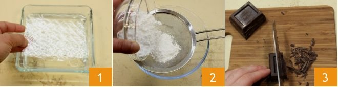 To prepare the chocolate panna cotta with caramelized bananas, start with the panna cotta: soak the gelatin sheets in a bowl of cold water 1 for at least 10 minutes. Sift the powdered sugar 2 and chop the dark chocolate 3.