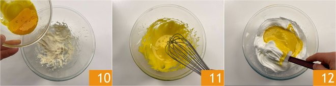 Add the egg yolks 10 and mix once more 11. Pour this mixture into the bowl with the beaten egg whites and fold from the bottom up to avoid deflating the mixture 12. Place the mixture in the fridge while preheating the oven to 320°F.