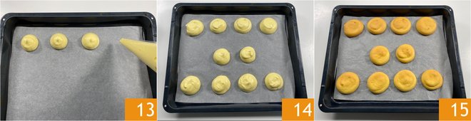 Put the mixture in a piping bag without a nozzle and form domes on a baking tray lined with parchment paper 13; with these quantities, you will get 10 domes 14. Bake at 320°F for 30-35 minutes. Remove from the oven and let cool completely 15.