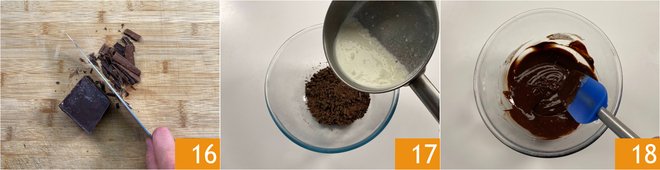 Meanwhile, prepare the ganache: chop the dark chocolate 16 and put it in a bowl, then add the hot cream 17 and stir until all the chocolate has melted 18.