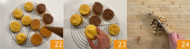 Transfer the ganache into a piping bag and fill 5 domes 22, then cover with the remaining ones 23. Chop the hazelnuts 24.