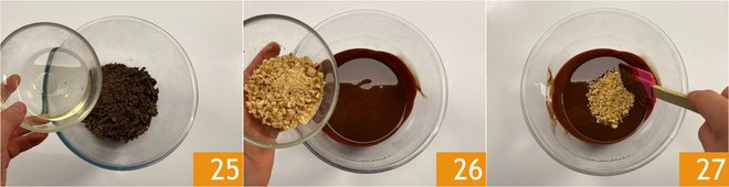 In a bowl, put the chopped dark chocolate, add the oil 25, and melt. Then add the hazelnuts 26 and stir 27.