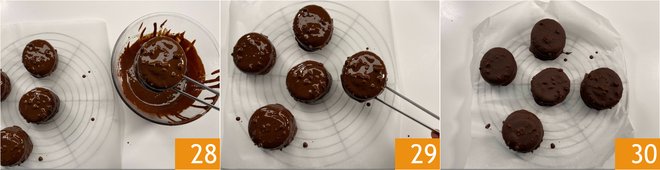 Dip the cakes into the chocolate, then let them drain to remove the excess 28. Place them on a rack 29 and let the glaze set. Your chocolate pie cakes are ready to be enjoyed 30!