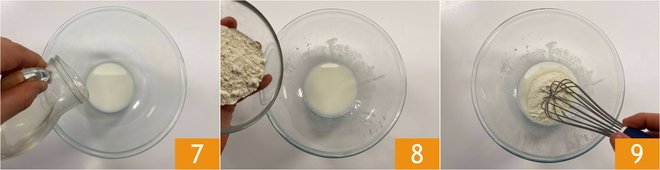 In another bowl, pour the milk and oil 7, mix quickly, then add the flour 8. Mix for a couple of minutes with a hand whisk 9.