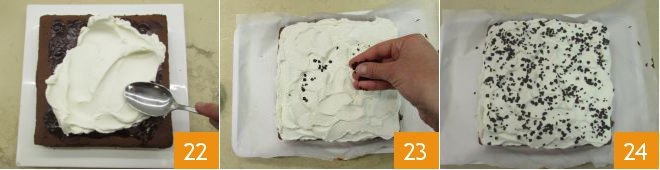 At this point, cover the cake with the cream, spreading it with the spatula 22 to create a wavy pattern. Garnish with dark chocolate flakes 23, serve your poke cake cut into cubes 24.