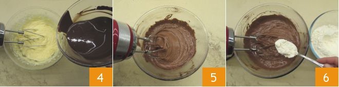 Continue to beat the mixture until it is light and homogeneous, at this point also add the dark chocolate melted in a bain-marie or microwave 4, ensuring it has cooled. Turn on the beaters again and mix until you get a homogeneous mixture 5. Now incorporate the flour previously sifted through a sieve 6.