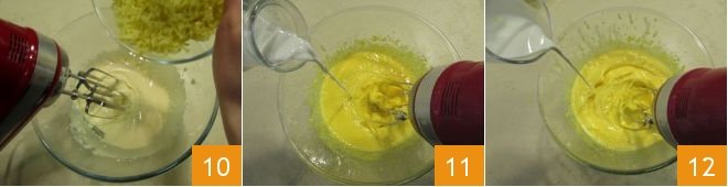At this point, take the yolk mixture you set aside, add the mashed potatoes 10, and mix with the electric whisk. While keeping it running, also add the milk 11, the cream 12,