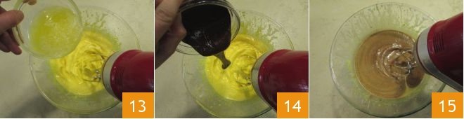 the melted butter 13, and the cooled melted chocolate 14. Work the mixture with the whisk until you get a smooth and uniform consistency 15.