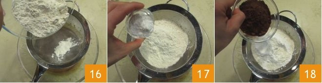 Now sift the flour 16, baking powder 17, and unsweetened cocoa powder 18 into the bowl