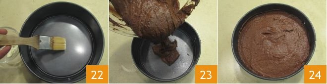 Butter a 20 cm springform pan 22, pour the cake batter inside 23, and level the surface 24, then bake in the preheated static oven at 350°F for about 60 minutes, placing the pan on the lowest rack.