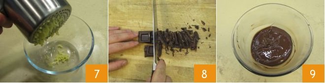 Cut the potato into chunks and mash it in a bowl using a potato masher 7. Preheat the oven to static mode at 350°F, then melt the butter in a saucepan and let it cool. Finally, chop the dark chocolate with a knife 8 and melt it in the microwave, operating it a few seconds at a time and being careful not to burn it 9.
